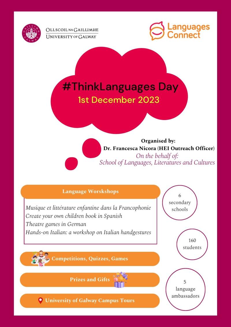 Think Languages Day is part of #ThinkLanguages Week, a national celebration promoted by Languages Connect across Ireland to highlight the value, joy, and diversity of language learning. At the University of Galway, we host a full-day event during which Transition Year students from local secondary schools are invited to experience languages in a hands-on, inspiring way. This year's Think Languages Day at the University of Galway will be hosted on the 21st November 2025!